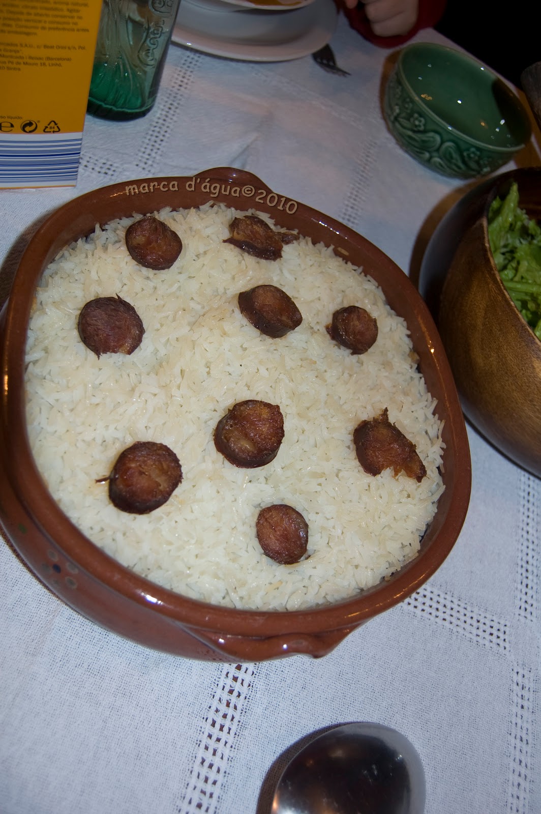 Voltando ao meio pato dos campos da Lourinhã: mergulhou na panela de pressão acompanhado por uns quantos cravos cabecinha, uma cebola, um bom pedaço de chouriço de carne de Ponte de Lima (no Pingo Doce encontra-se da melhor qualidade!) sal e pimenta. Assim esteve em serena sauna cerca de meia hora. Entretanto, o forno pré-aquecido a 200°C. Finda a cozedura do patito, espera-se que este arrefeça um pouco para ser desfiado, coa-se a água da cozedura que é então aproveitada para cozer o arroz. Depois é só ir fazendo camas de arroz e deitando os pedacinhos de pato por cima num tabuleiro de barro. Após a última cama de arroz, colocam-se as rodelas de chouriço e leva-se ao forno cerca de 20 minutos.