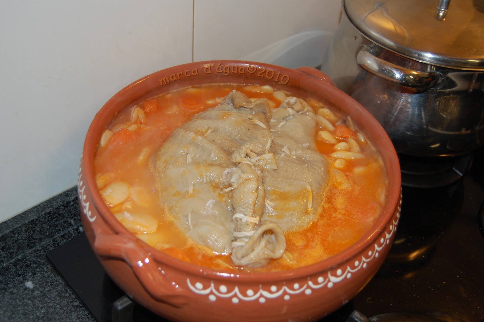 Depois tratei do meio quilo de feijoca (o Vasco, a quem compro a feijoca, chama-lhe feijão-fava). Ficou a demolhar de um dia para o outro e a seguir teve que esperar que refogasse num tacho de barro uma cebola grande, três dentes de alho, dois tomates pelados, duas cenouras cortadas em rodelas grossas, chouriço de carne e bacon em tiras finas. Quando chegou a vez de a feijoca entrar para o tacho, levou um banho de 2,5 dl de vinho branco e uma boa pitada de gindungo. Dizem que não se pode pôr sal porque, caso contrário, o feijão não coze. E eu cumpri esta recomendação, pelo que só deitei sal quando a feijoca estava quase cozida. Além do sal, juntei ainda uma colher de café de cominhos. Depois de tapado o tacho, fui vigiando o caldo e ainda tive que acrescentar mais um copo de água.