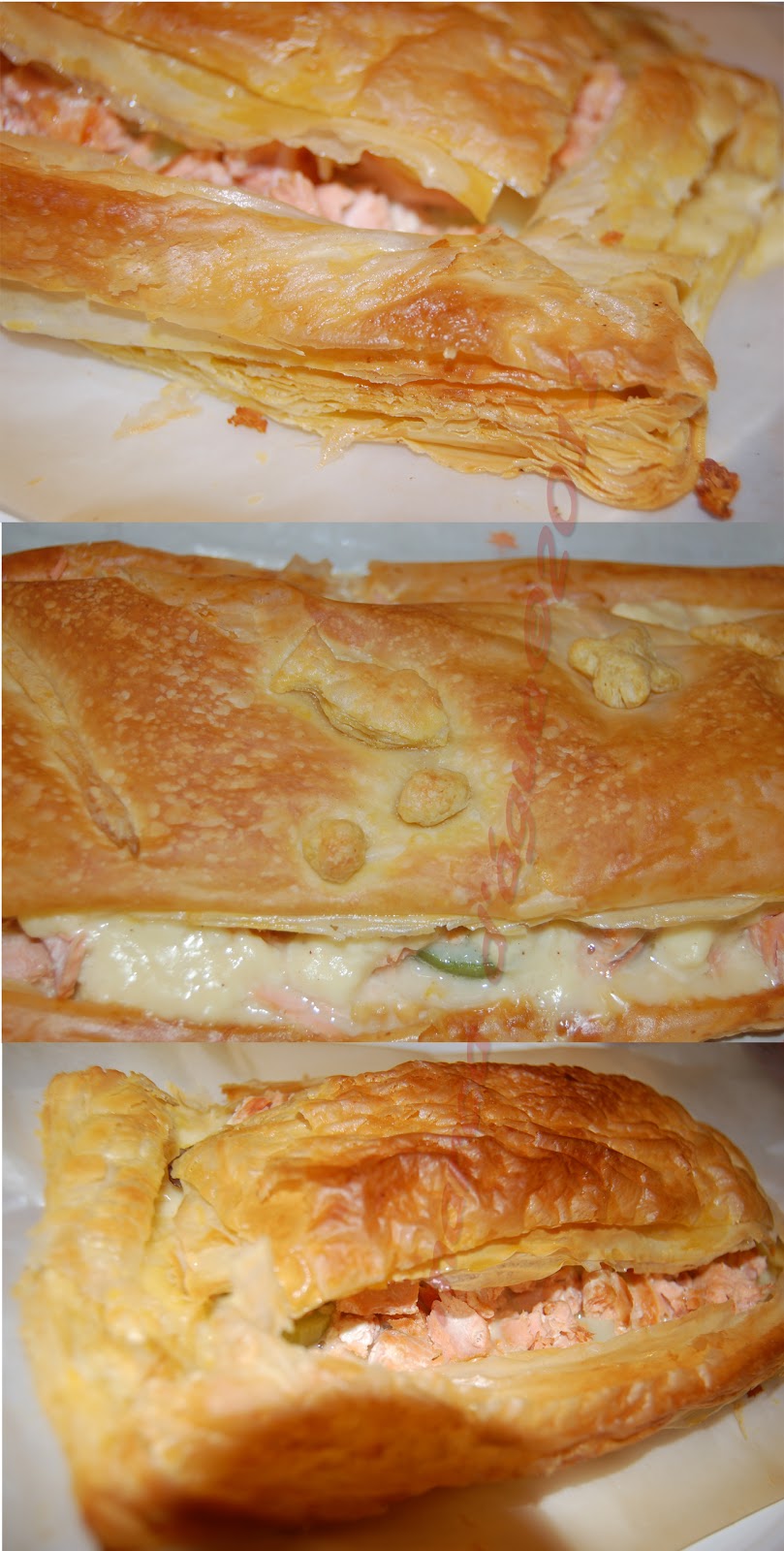 A massa folhada foi devidamente golpeada para formar uma caixa com tampa e metida no forno a 200°C. Entretanto, desfiz os lombos de salmão a golpes de faca e garfo. Quando a massa folhada adquiriu a forma de caixa pretendida, tirei-a do forno, retirei a «tampa» e fiz uma cama com o alho-francês e os cogumelos. Por cima, deitei o salmão e cobri tudo com o molho béchamel. Para terminar, tapei com a tampa (que raio de pleonasmo!!!). Voltou a ir tudo para o forno mais cerca de 10 minutos... et voilá!