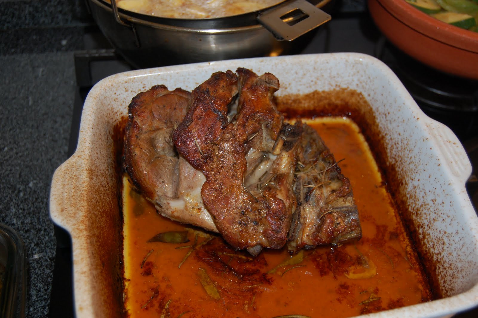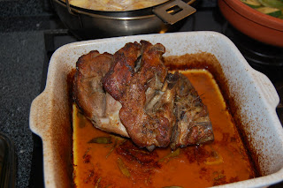Depois, quando achei que estava no ponto, ainda reguei a perna (a do borrego, e não a minha!) com banha de porco preto e deixei-a de castigo mais 10 minutos no forno, com este já desligado mas a mandar calor suficiente para as gorduras se entranharem umas nas outras.